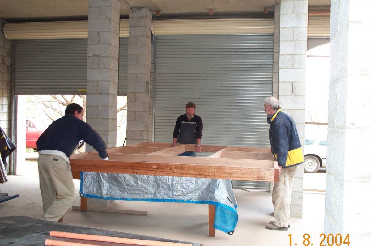 Pat, Tim and Hans constructing the window frames. Until they were built the roller doors were the only doors!