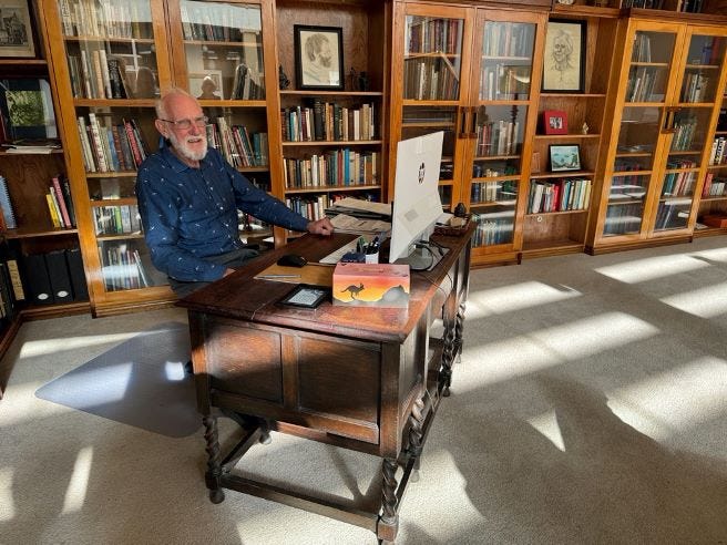 Hans sitting at Tillie’s desk in the library he also built. (Photo: Lis Bastian)