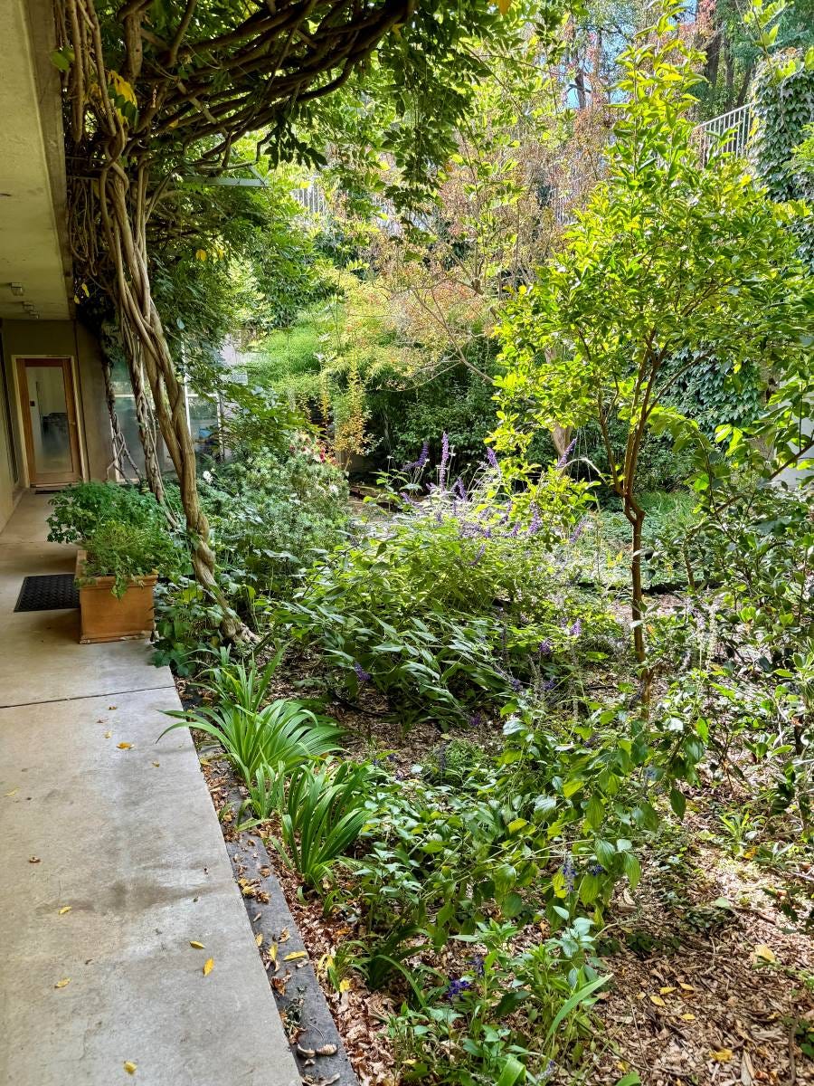 Looking down from the roof of Hobbit Hall into the peristyle garden. (Photo: Lis Bastian)