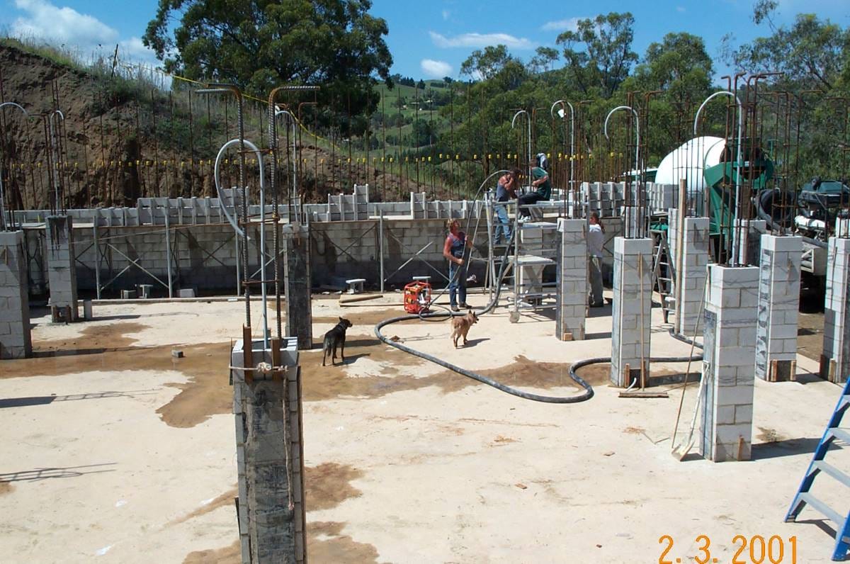 In 1995, after nineteen years of camping and tree planting, Hans and Tillie had a large hole excavated into the hill at the top of their property to begin building Hobbit Hall. They wanted to build a home that would withstand extreme weather events. Building underground meant that the house temperature would be moderated by the having the walls and roof in contact with the earth which is at an all-year-round temperature of 14C regardless of freezing winters or sweltering heatwaves. It could also withstand high winds and be protected from fire. They began pouring concrete in 2000.