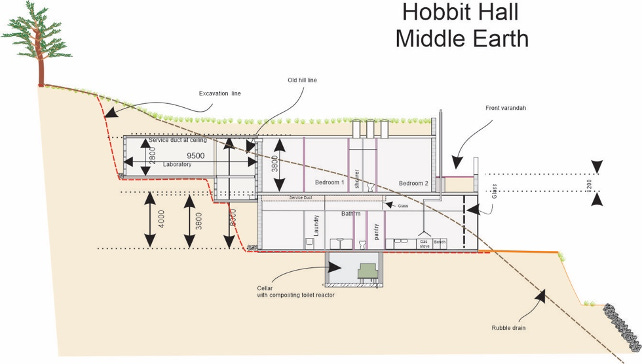Elevation showing how Hobbit Hall has been built into the hill with 1 ½ metres of soil on the