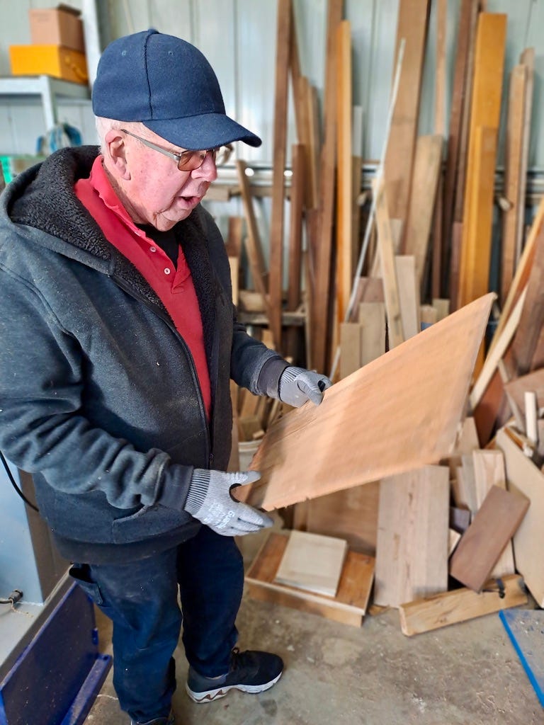 Jim Watson holding a quality piece of recycled oak from a discarded desk