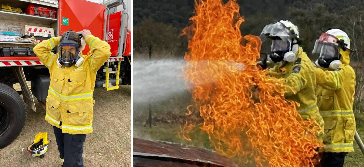 Left: Aurelia suiting up in RFS operational gear. Right: Aurelia Parsley and another RFS member during vehicle fire-fighting training. (Photo: Tim Parsley)