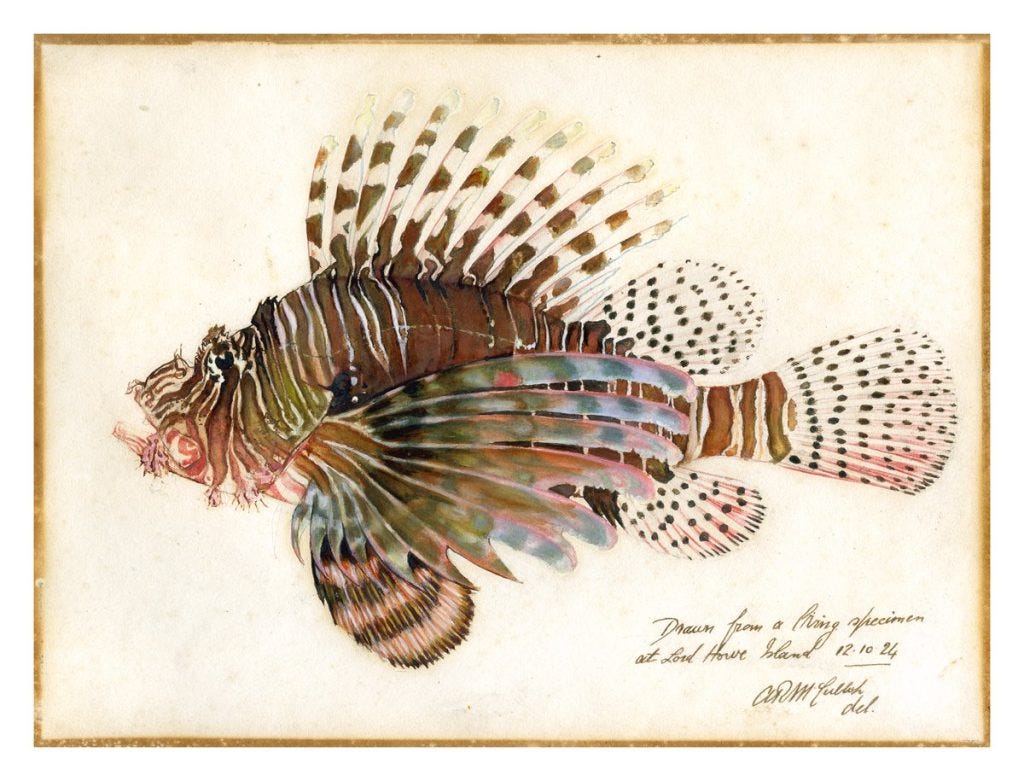 Watercolour: Red Lionfish, Pterois volitans. (Allan McCulloch. Courtesy Australian Museum.)