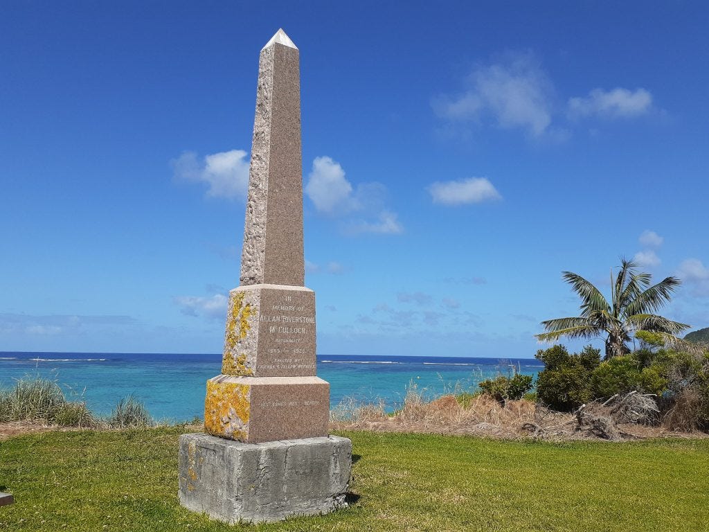 The suicide impacted McCulloch’s final resting place too. At that time a suicide could not be buried in consecrated ground, so instead of being buried at the city of his birth, Sydney, McCulloch’s ashes are interred at a monument dedicated to him on his beloved Lord Howe Island.