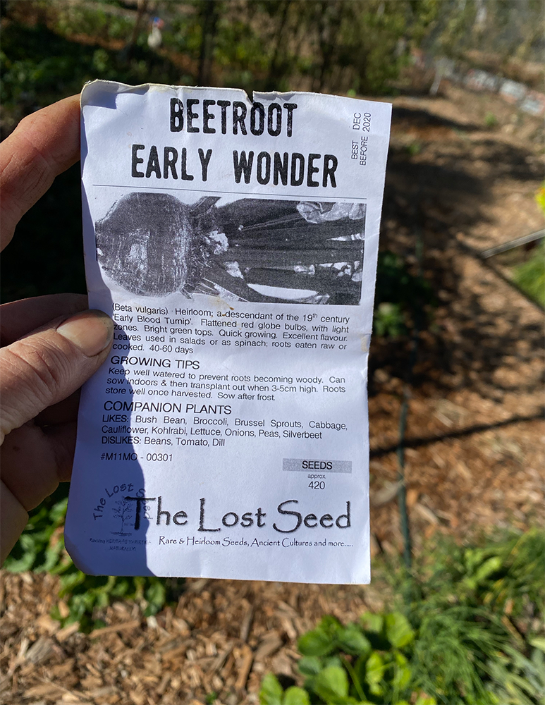 You can still plant out seeds for silverbeet now, despite the cold, and I’m keeping my fingers crossed that these little beetroot seedlings will be advanced enough to develop before winter sets in.