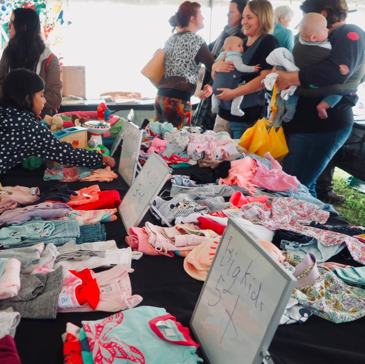 Parents exchanged clothing and smiles at a Kid’s Clothing and Toy Swap organised by Blue Mountains Parents For Climate. (Photo: Linda Moon)