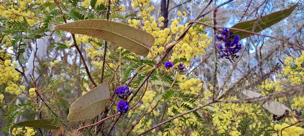 Hassans Walls Reserve: False Sarsaparilla (Hardenbergia violacea) twines around Sunshine wattle (Acacia terminalis). Blue Mountain Ash (Eucalyptus oreades) behind. (Tracie McMahon)