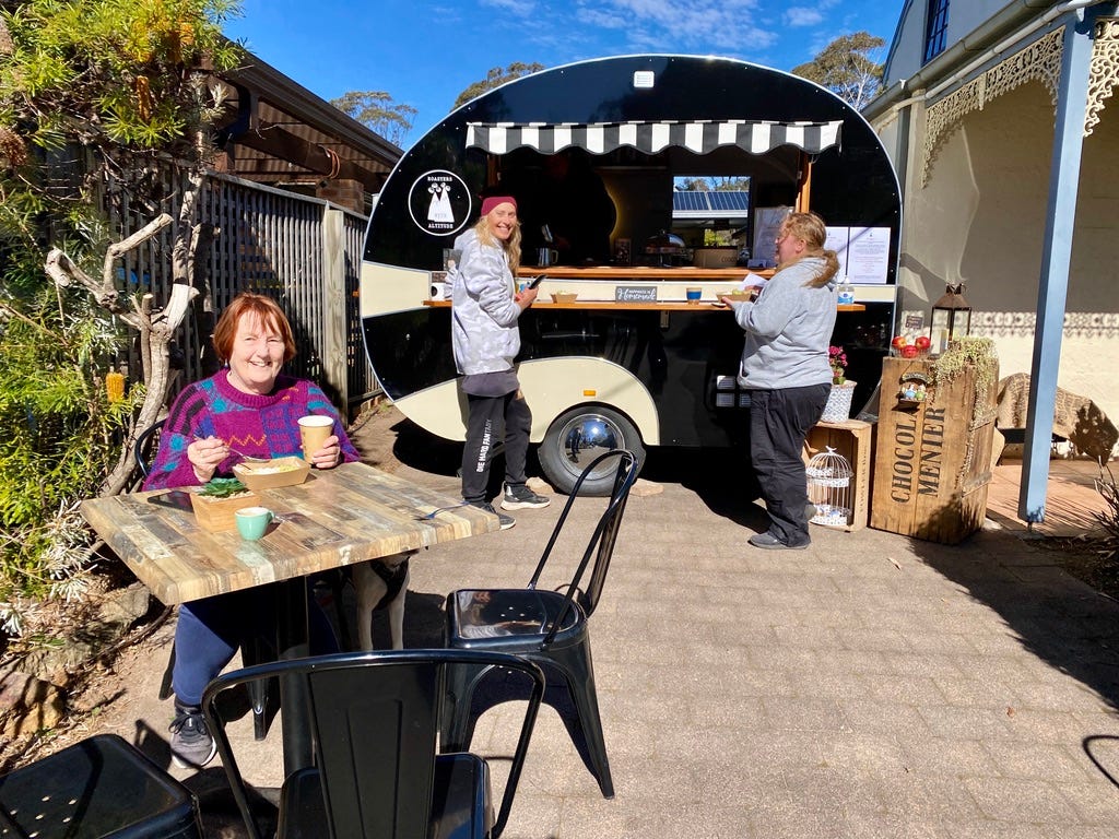 On my second visit I’m pleasantly surprised to find myself enjoying lunch with a yoga teacher from Sydney, a social work student who works in child protection, the retiring District Governor of Rotary who created HUFF (Heads Up for Fire or Any Emergency), Libby, and my husband who didn’t need to be asked twice to return.