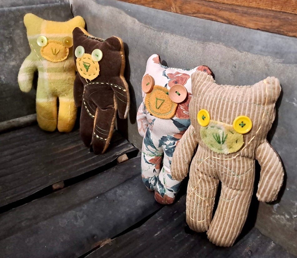 Each Re’kleimee (pictured above) is unique and made from recycled materials. She adopts an 80/20 rule as part of her design ethic, where a minimum of eighty percent of her content is upcycled. Willowa sources materials locally from donations and op-shops, selecting fabrics for their sensory delight. Favourites include soft blankets, ribbed corduroy, velvet and cotton drill. She then sews and stitches unique embroidered designs. Finally, she hand-stitches a sequential number on the rear leg of each Re’kleimee, before taking them to selected retailers.