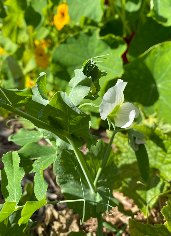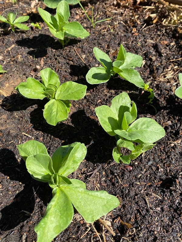 While we’ve been collecting our summer’s crop of bean seeds, we’ve also been planting our next nitrogen-fixing crops directly into the garden: Melting Mammoth Snow Peas and Coles Dwarf Broadbeans. The peas are coming up around the beans and the cucumbers and a small self-seeded pea from last season has already produced its first two snowpeas!