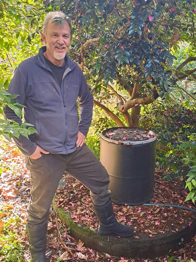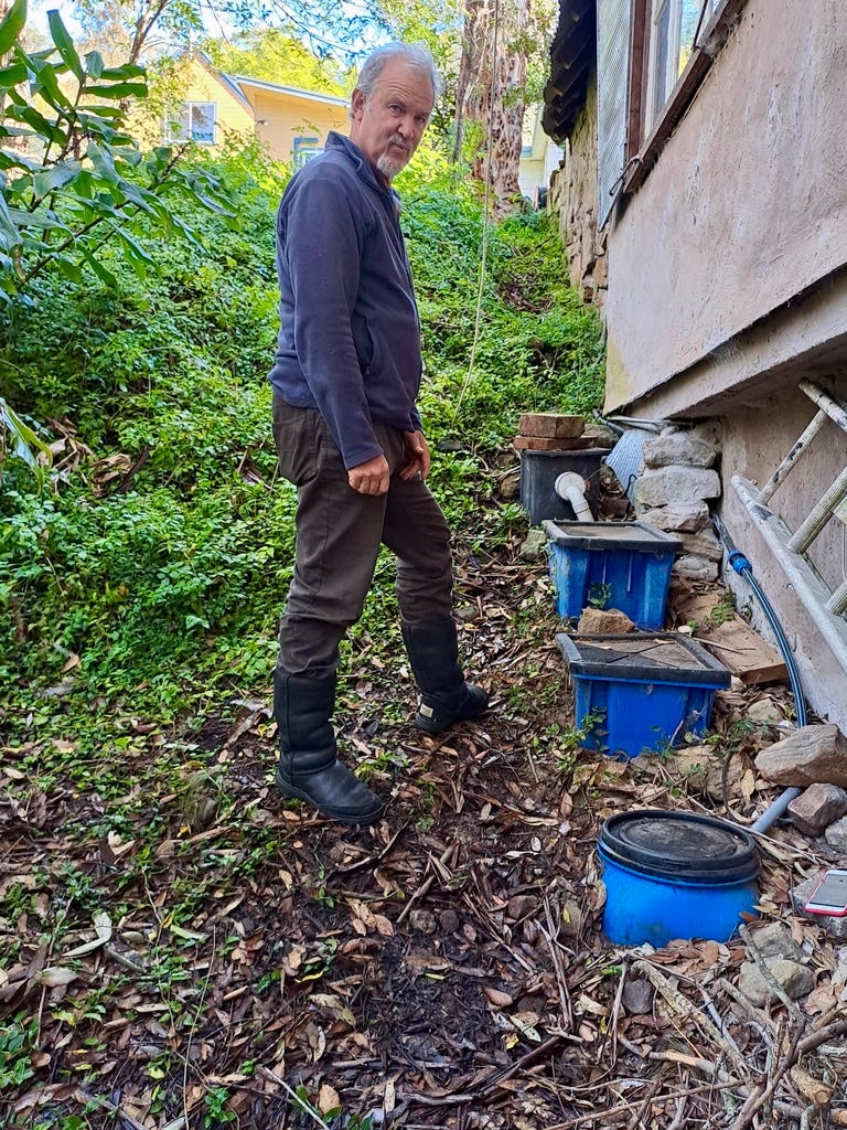 “Most people around here either have septic or chemical systems. I had septic but one weekend my son and I emptied it and converted it into a wet worm farm – a worm-based disposal system. The water and waste material goes to the top of the pile, the water filters through and then the worms go to work and consume the solid waste which adds to the compost pile. In a simple and efficient way, the water drains off the bottom and is pumped to wherever it’s needed.”