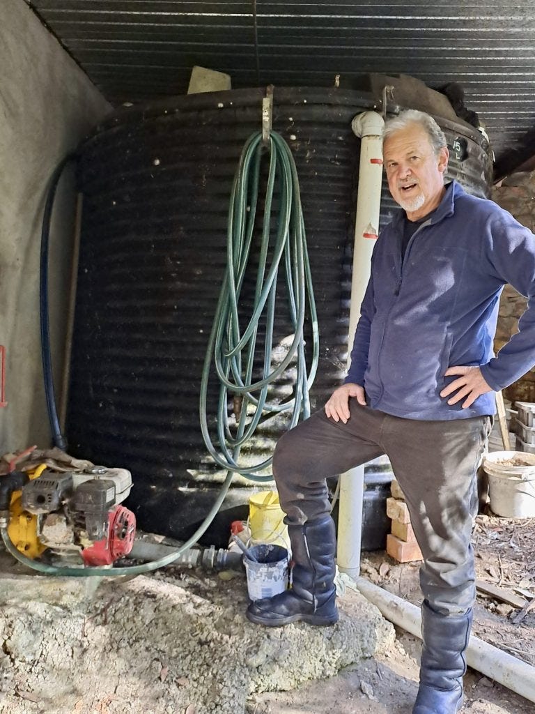 Fire protection set-up. “I’ve got lots of water, knowing that lack of stored water is often a big factor in houses getting lost in bushfire. I’ve currently got trees too close to the house so I will do some trimming before summer.“