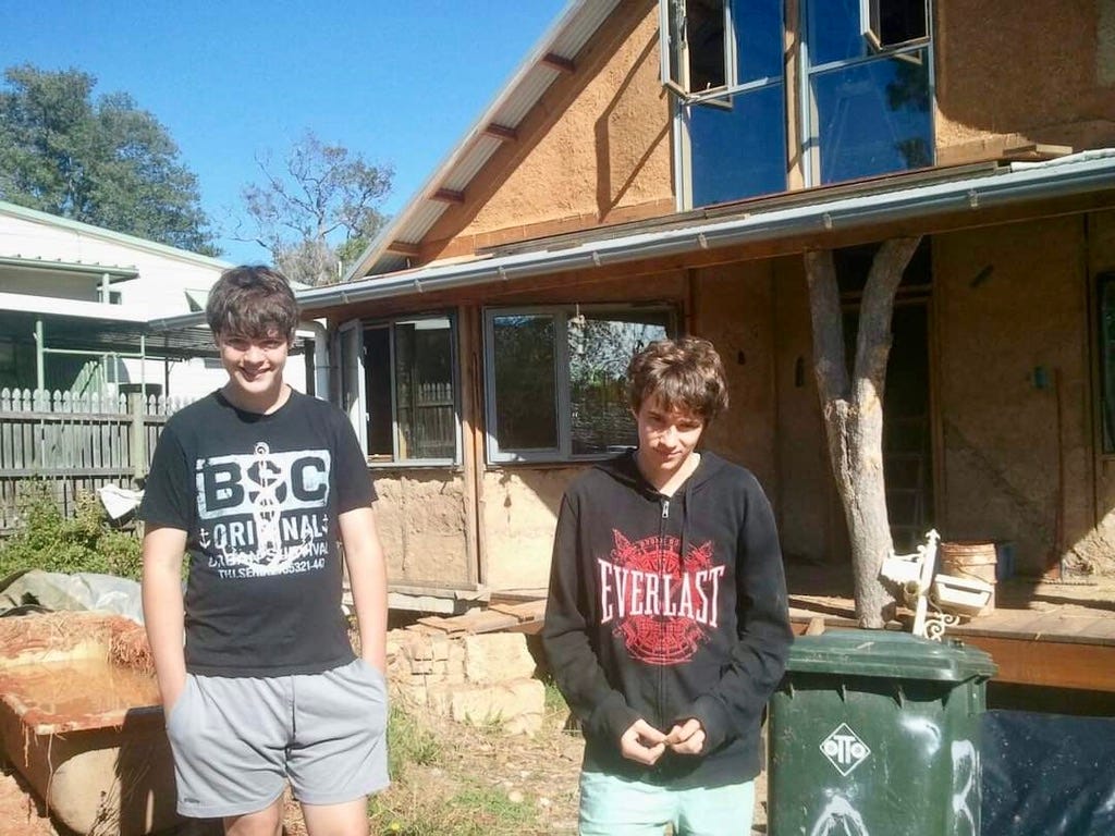 The walls were made of wasted clay and soil fill taken off other building sites. The front verandah posts were recycled yellow blood wood trees that had died in the backyard. Concrete form block foundations were made from recycled crushed concrete and road base. Reject Australian hard wood black butt was used in timber framing and a rice straw bi-product of rice production was used in the wall insulation.