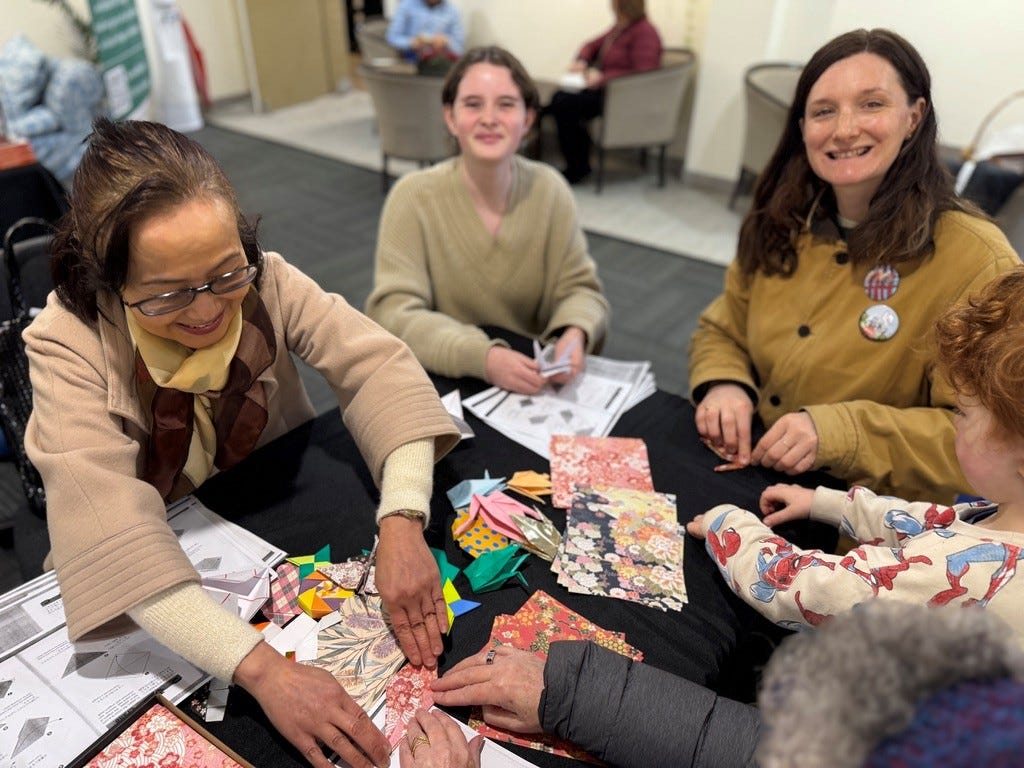 Later, in the lunch break, she helped children and adults to make the origami cranes that remain a poignant symbol of the desire for life of Sadako Sasaki, a child victim of the Hiroshima bomb.