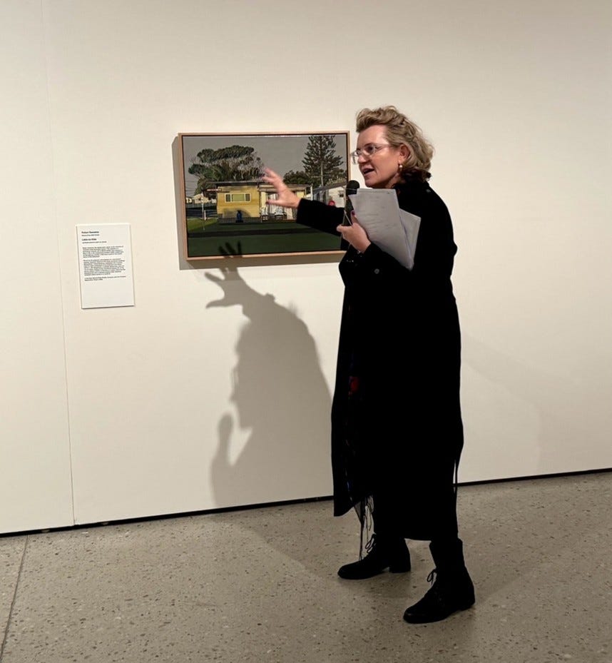 And the paintings aren’t just idyllic visions of Australia’s ‘stunning natural beauty’. They recognise, for example, that the landscapes many of us are familiar with are crowded cityscapes, burnt bushland, stolid suburban homes or, as in Robyn Sweany’s painting, a ‘permanent’ caravan in a holiday park … reflecting the ‘view’ so many see during our current housing crisis.