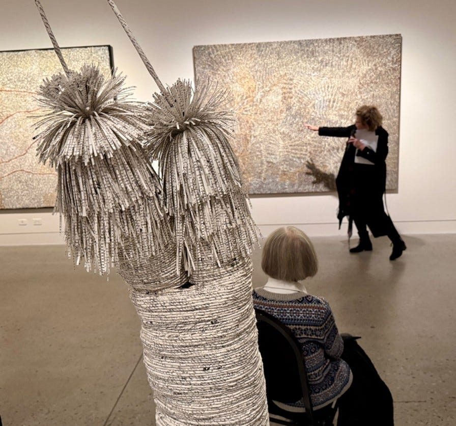 Beatrice Gralton, Senior Curator of Contemporary Australian Art from the Art Gallery of NSW starting her floor talk in front of the winning artwork by Djakaŋu Yunupiŋu, painted with natural pigments on bark.