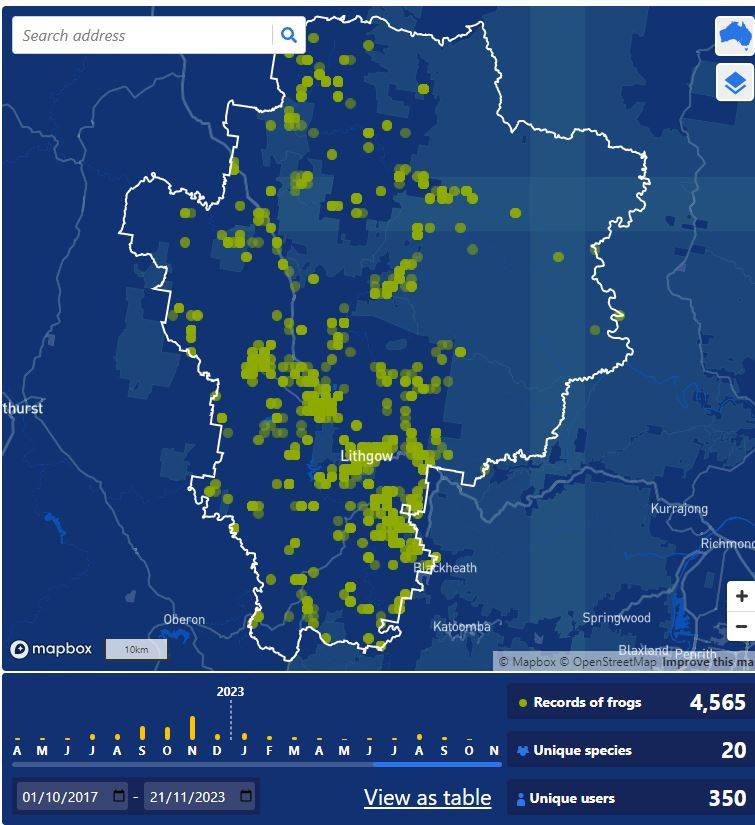 Extract from FrogID data 21-11-23, in the Lithgow LGA