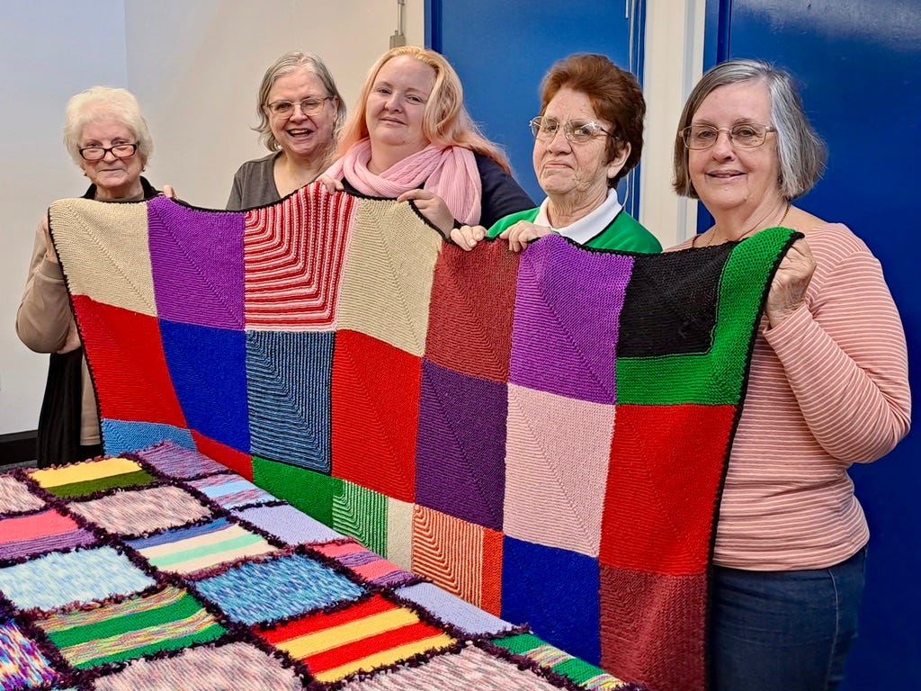 Several blankets are dropped into the centre each week. Bags full of squares are also regularly donated, sewn together by a dedicated volunteer into blankets and lap rugs gifted to local people in need.