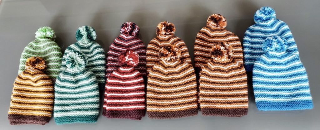 Some of Dee’s colourful beanies.