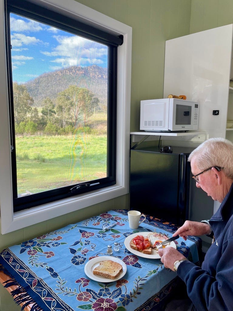 Olwyn has family connections to the Wolgan Valley. Her niece and young family live on land which has been in the family for over eighty years. In the 2019-2020 bush fires, Olwyn says she nearly lost those relatives as the fire front advanced on three sides. Thankfully, they all lived to tell a harrowing tale. In retirement, Ross and Olwyn wanted to spend more time in the valley while remaining independent. They also wanted to ensure that anything they built or bought would avoid the threat of fire and not strain the resources of the valley. So began the Wolgan tiny house project!