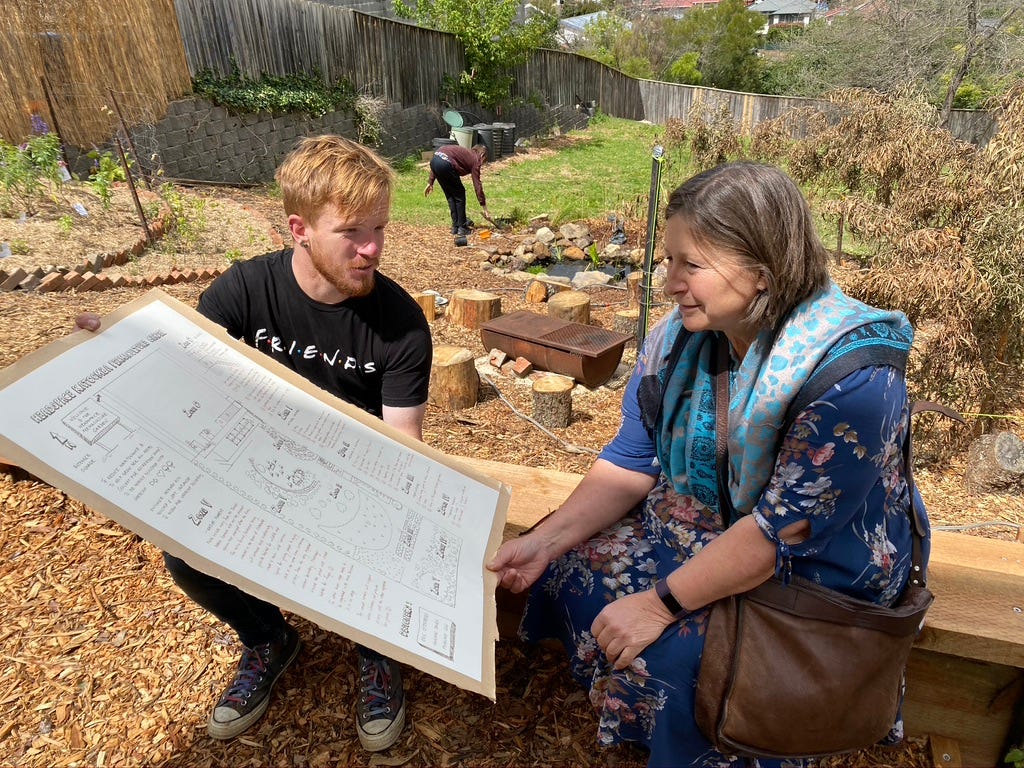 Photo: Vaughan showing the design for the Headspace Katoomba garden to Suzie van Opdorp
