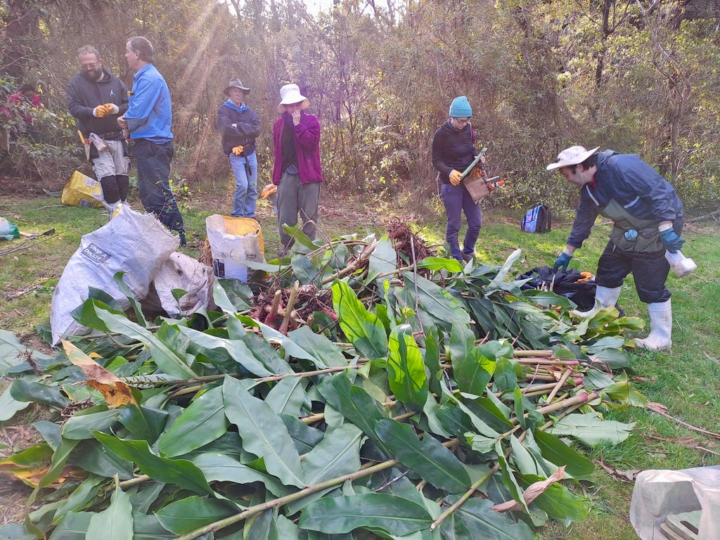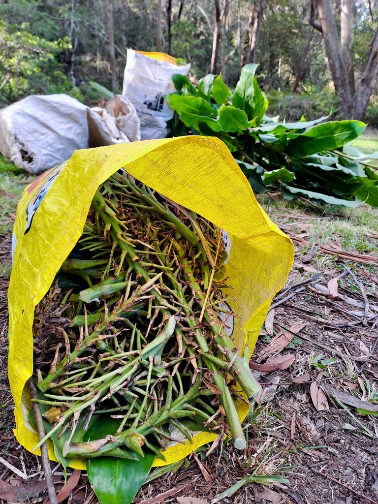 While wrangling a bush of Zebra Grass, a couple of Bushcare volunteers discuss the broad impacts of the weed as well as the best approach to hoist it out. One volunteer is a newcomer, the other is an old hand. They alternate wielding a mattock and tugging at the invasive grass, chatting when they are not catching their breath.