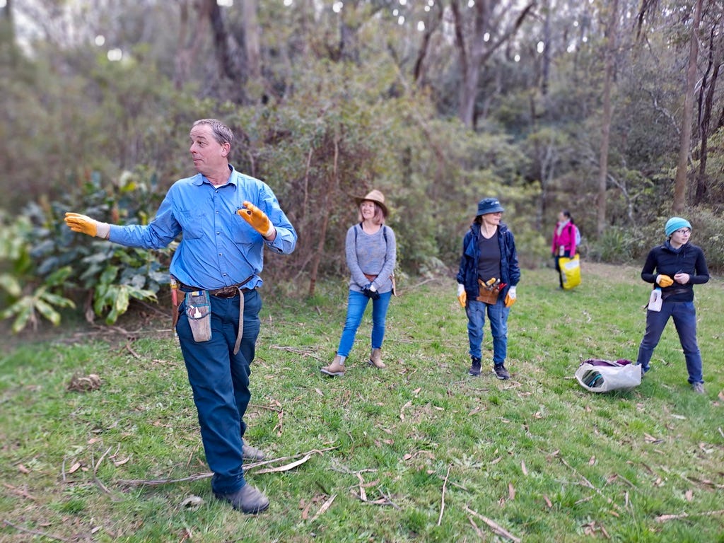 The old hand, Paul, who also teaches horticulture at TAFE and runs his own garden maintenance business, tells the newcomer, David, that the main aim is keeping sediment out of the creek, so they try to disturb the soil as little as possible. He explains that urban runoff has caused weed infestation problems downstream, and David asks questions, soaking up the information.