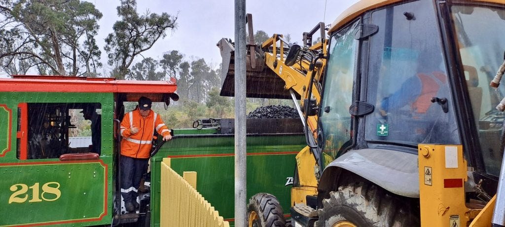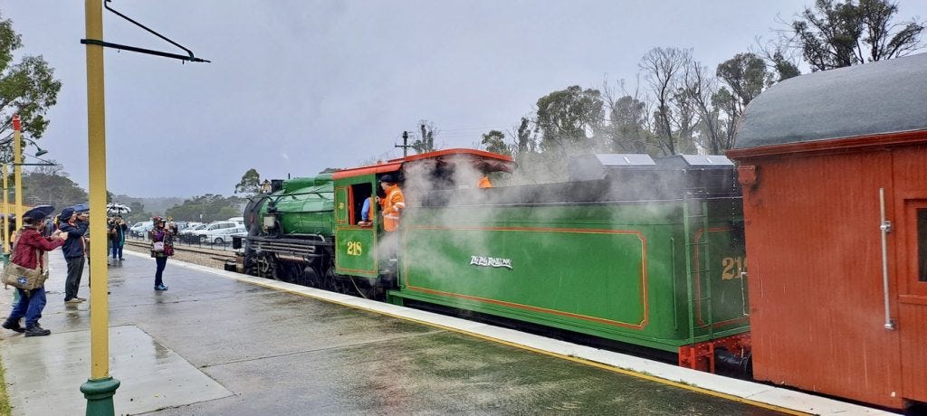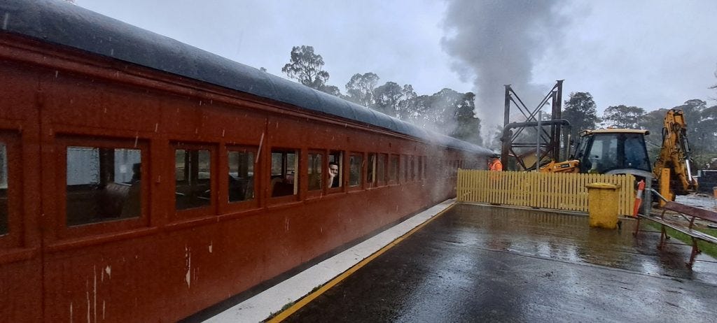 I find myself at Clarence station readying for the long-awaited sight of a steam engine chuffing up the rails. Around me there are scores of families. An excited child marvels at the white stone ballast between the rails: “look how white the rocks are. Not black like before. It’s so cool. I have to stay calm!” Older generations remember past trips to Bottom Points and beyond. I chat to the parents of two volunteers, who tell me they first took the elder of their two sons here in the 1990s as a ten-year-old, his brother soon followed and “the rest is history.” They, like me, are holding their breath, huddled under umbrellas, their faces beaming with pride. Both of their sons are manning the engine today.